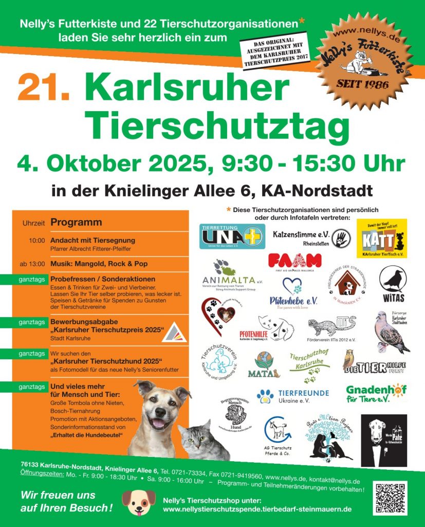 Liebe Tierschutzfreunde, wir möchten Sie auch in diesem Jahr zu unserem 21. Karlsruher Tierschutztag am 04.10.25 von 9:30 -15:30 Uhr sehr herzlich in die Knielinger Allee 6 (bei Nelly’s