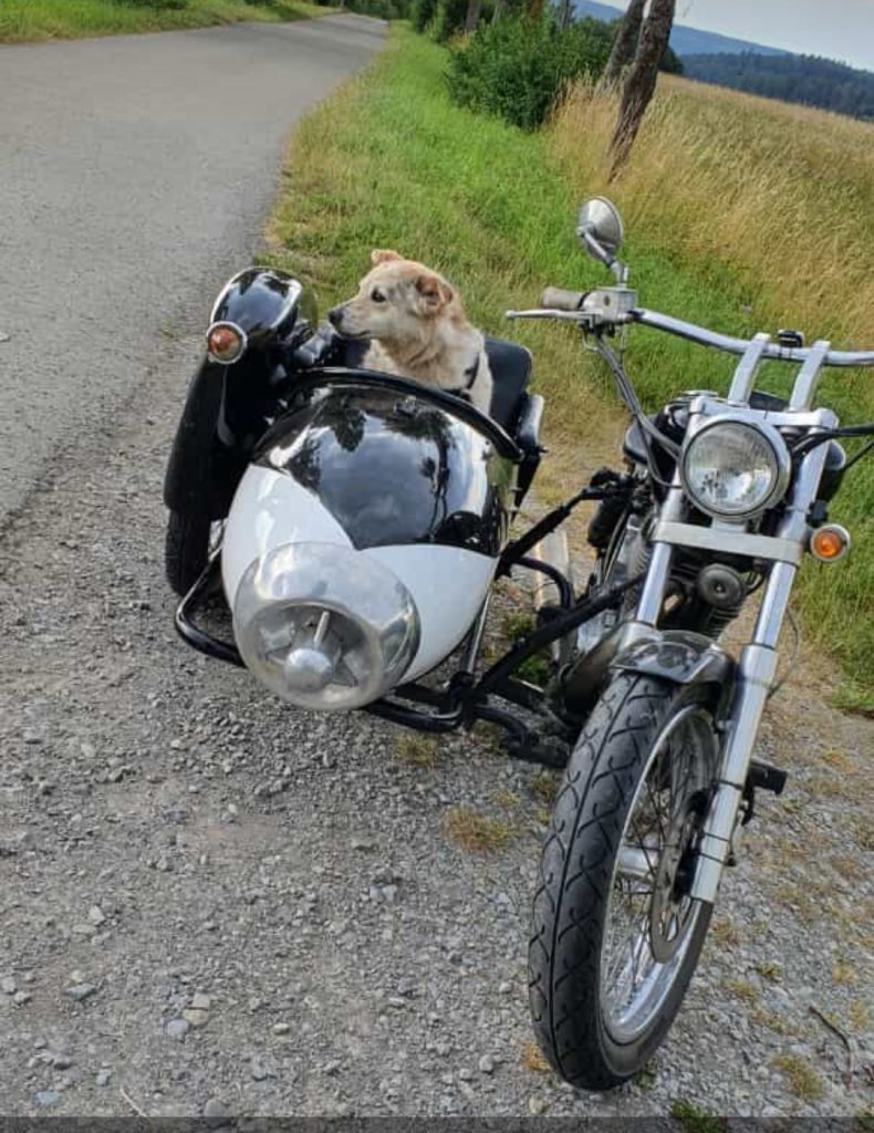 Bereits nach einigen Tagen erhielten wir Fotos mit Bella als Beifahrer im Motorradbeiwagen! Seither erreichten uns viele herrliche Bilder einer glücklichen Hündin und eines glücklichen Frauchens – die von Bella im Alltag begleitet wird mit einer Selbstverständlichkeit als hätte sie immer bei ihr gelebt.