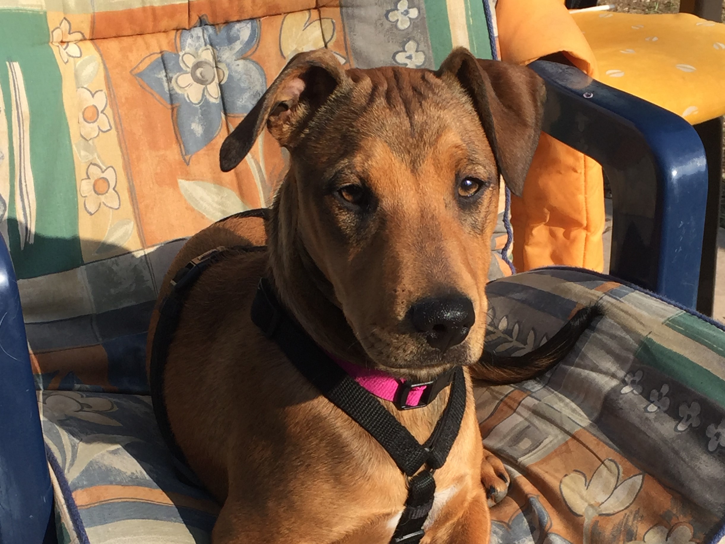 Kessi ist im Oktober 2019 geboren und mit einer Schulterhöhe von ca. 55 cm ein mittelgroßes, bildhübsches Terrier–Mix Mädchen, die voller Power ist. Mit ihrer